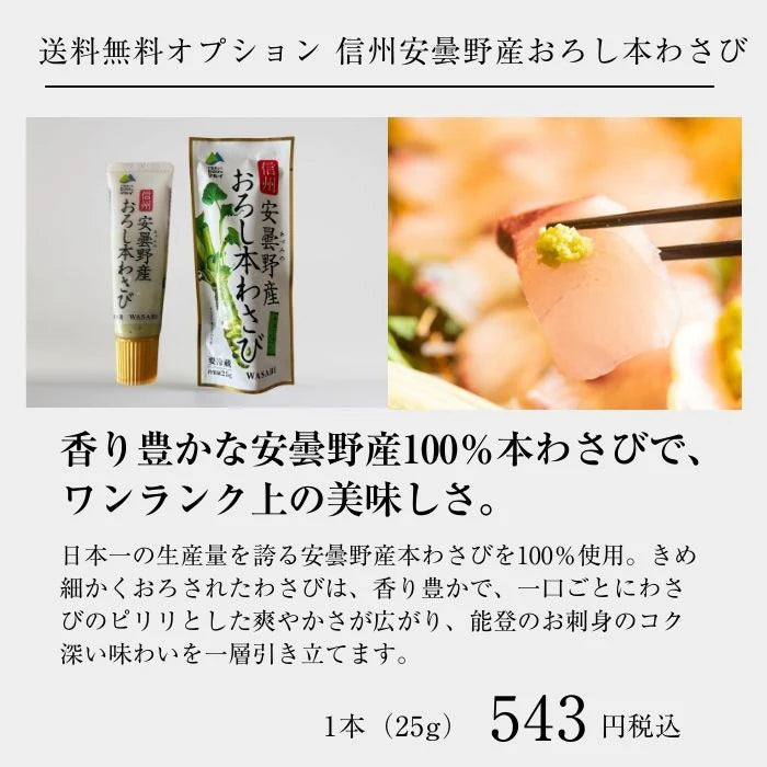 ミシュラン店採用、能登の魚に合うように開発されたジューシーな旨口の純米大吟醸無濾過生原酒がセットで届きます。