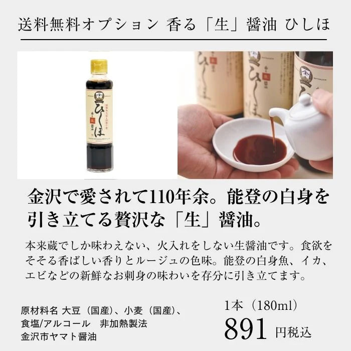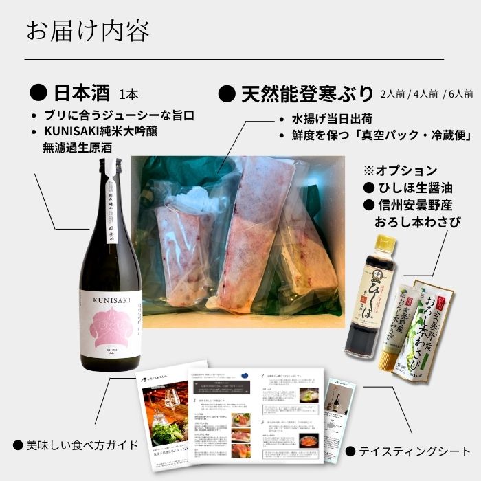 朝獲れの新鮮な能登寒ぶりとピッタリ合う日本酒、さらにオプションで刺身にぴったり合う「ひしほ生醤油」を送料無料で追加いただけます。能登寒ぶりをより美味しくお愉しみいただける冊子付きです。