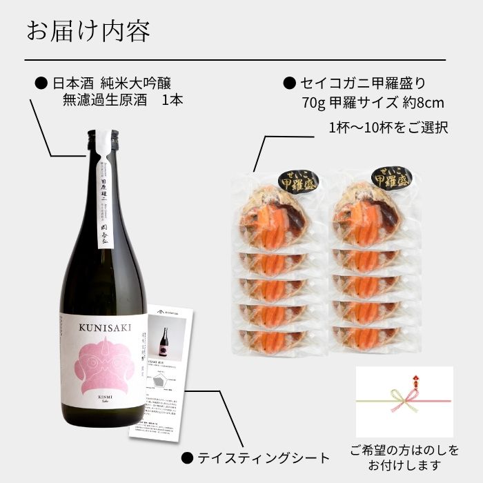 セイコガニとセットで届くのは、しっとりとした甘みと繊細な酸を持つ、少量生産の純米大吟醸・無濾過生原酒。