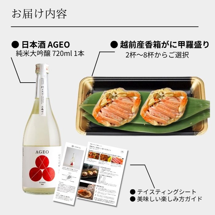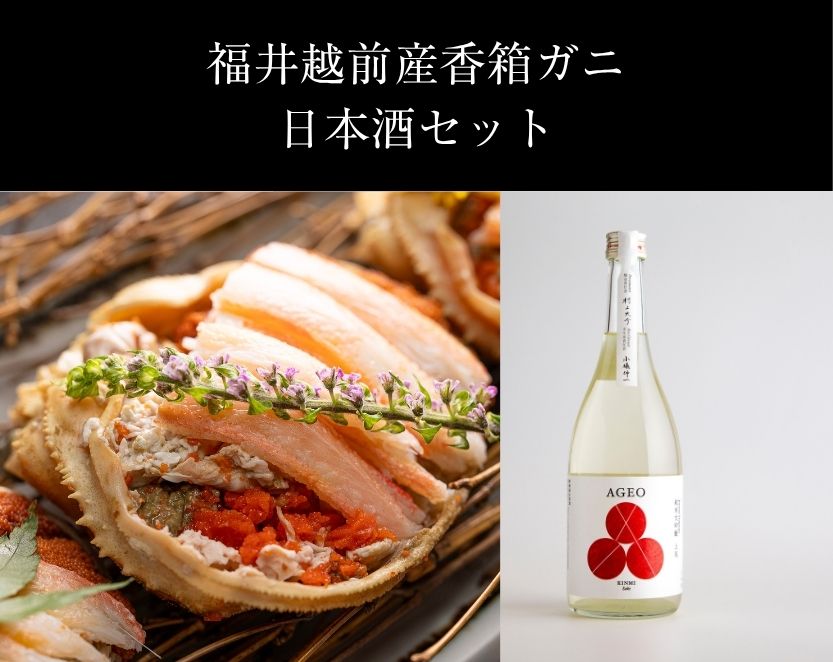 日本酒はミシュラン店でも採用されている、少量生産の無濾過生原酒。濃厚な甘みの香箱ガニに合う、芳醇な純米大吟醸がセットで届きます。