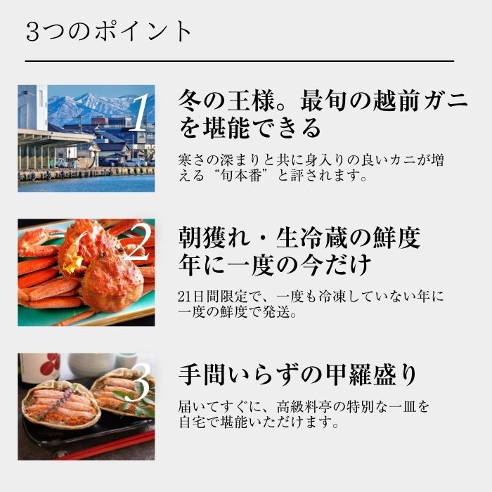 毎年 11月6日、福井県では「越前がに」の漁が一斉に解禁されます。この日を境に、港町は活気に満ち、まさに“かにの季節”が始まります。 限られた越前がにの解漁期間のうち、当ショップで「一度も冷凍しない状態=朝獲れ・生冷蔵」でご自宅にお届けできるのは、わずか21日間です。