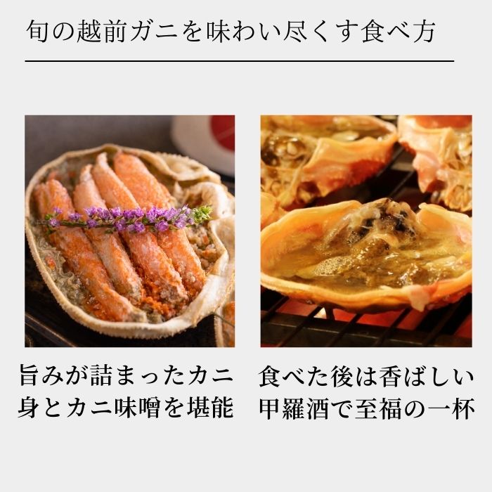 旬の時期ならではの型の良い越前がにを厳選してお届けいたします。たっぷり詰まったカニ身とカニ味噌をお楽しみください。